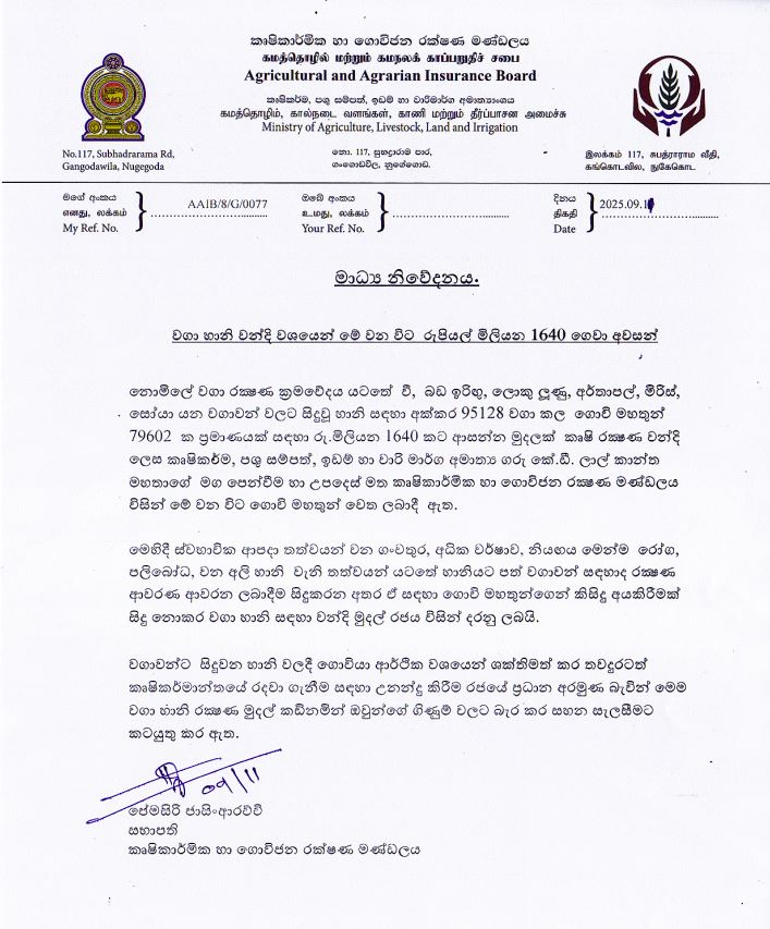 වගාවන්ට සිදුවන හානිවලදී ගොවියා ආර්ථික වශයෙන් ශක්තිමත් කර තවදුරටත් කෘෂිකර්මාන්තයේ රදවා ගැනීම සඳහා උනන්දු කිරීම රජයේ ප්රධාන අරමුණ බැවින් මෙම වගා හානි රක්ෂණ මුදල් කඩිනමින් ඔවුන්ගේ ගිණුම්වලට බැර කර සහන සැලසීමට කටයුතු කර ඇති බවද එම මණ්ඩලය වැඩිදුරටත් සඳහන් කරයි.