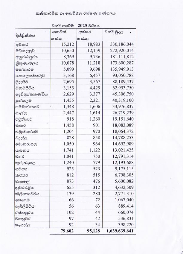 නොමිලේ වගා රක්ෂණ ක්රමවේදය යටතේ වී, බඩ ඉරිඟු, ලොකු ලූණු, අර්තාපල්, මිරිස්, සෝයා යන වගාවන්වලට සිදුවූ හානි සඳහා අක්කර 95128 වගා කළ ගොවි මහතුන් 79602 ක ප්රමාණයක් සඳහා රු.මිලියන 1640 කට ආසන්න මුදලක් මේ වන විට ගෙවා අවසන් කර ඇති බව කෘෂිකාර්මික හා ගොවිජන රක්ෂණ මණ්ඩලය සඳහන් කරනවා.
