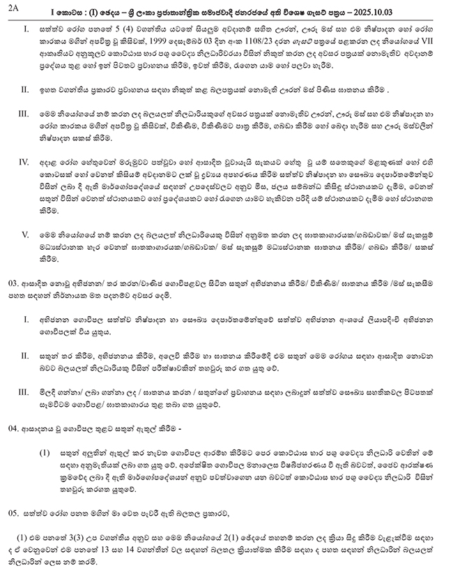 අදාළ ගැසට් පත්රය ඔක්තෝබර් මස 3 වන දින සිට ක්රියාත්මක වන අතර, ඉවත් කළහොත් මිස හෝ එම පනතේ 5(3) වගන්තිය අනුව වලංගු කාලය දීර්ඝ කළහොත් මිස ක්රියාත්මක වන දින සිට මාස 03කට නොවැඩි කාලයක් සඳහා වලංගු වන අතර, රෝග තත්ත්වය අනුව කාලය දීර්ඝ කිරීමේ හැකියාව ඇති බව ගැසට් නිවේදනයේ වැඩිදුරටත් සඳහන්ය.