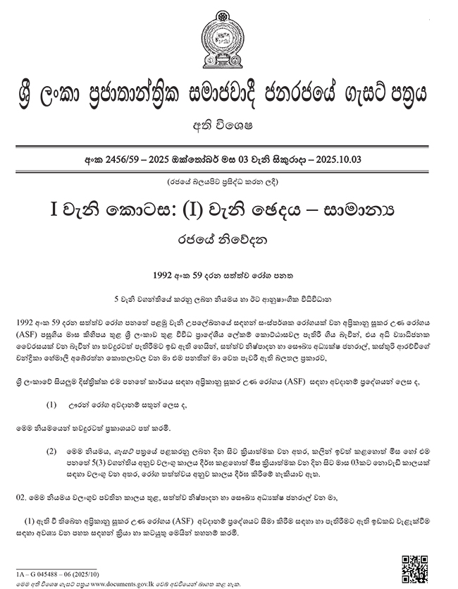 අප්රිකානු සූකර උණ රෝගය සම්බන්දයෙන් අති විශේෂ ගැසට් නිවේදනයක්