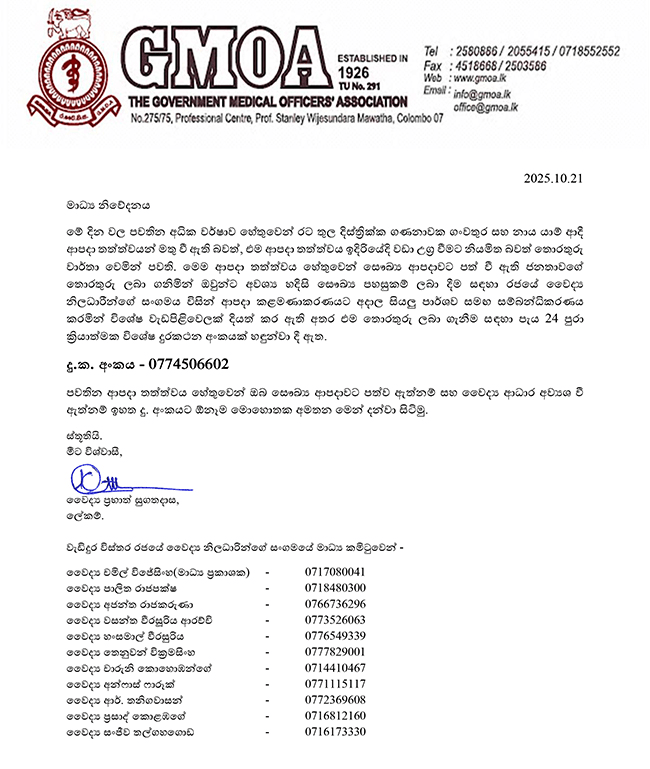 ආපදා තත්ත්වය හේතුවෙන් සෞඛ්ය ආපදාවට පත්ව ඇත්නම් සහ වෛද්ය ආධාර අව්යශ වී ඇත්නම් ඉහත දු. අංකයට ඕනෑම මොහොතක අමතන මෙන් රජයේ වෛද්ය නිලධාරින්ගේ සංගමය දන්වා සිටියි.