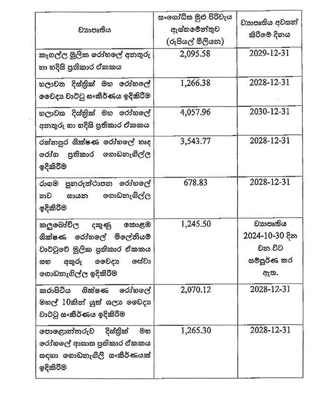 කෑගල්ල මූලික රෝහලේ අනතුරු හා හදිසි වාට්ටු සංකීර්ණය, හලාවත දිස්ත්රික් මහ රෝහලේ වෛද්ය වාට්ටු සංකීර්ණය, හලාවත දිස්ත්රික් මහ රෝහලේ අනතුරු හා හදිසි ප්රතිකාර ඒකකය, රත්නපුර ශික්ෂණ රෝහලේ හෘද රෝග ප්රතිකාර ගොඩනැගිල්ල, රාගම පුනරුත්ථාපන රෝහලේ නව සායන ගොඩනැගිල්ල ඉදිකිරීම, කළුබෝවිල දකුණු කොළඹ ශික්ෂණ රෝහලේ මිලේනියම් වාට්ටුවේ මූලික ප්රතිකාර ඒකකය සහ අතුරු වෛද්ය සේවා ගොඩනැගිල්ල, කරාපිටිය ශික්ෂණ රෝහලේ මහල් 10කින් යුත් ශල්ය වෛද්ය වෛද්ය වාට්ටු සංකීර්ණය සහ පොළොන්නරුව දිස්ත්රික් මහ රෝහලේ ආඝාත ප්රතිකාර ඒකකය සඳහා වන ගොඩනැගිලි සංකීර්ණයක් ඉදිකිරීම යන ව්යාපෘතිය සඳහායි.