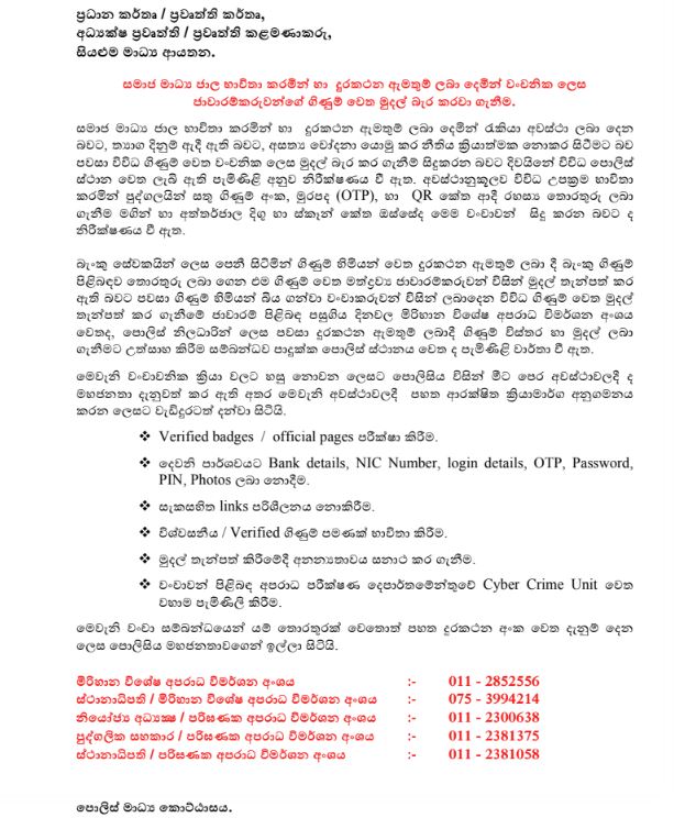සමාජ මාධ්ය ජාල භාවිතා කරමින් හා දුරකථන ඇමතුම් ලබාදෙමින් වංචනික ලෙස ජාවාරම්කරුවන්ගේ ගිණුම් වෙත මුදල් බැර කරවා ගැනීම් සම්බන්ධයෙන් දිවයිනේ විවිධ පොලිස් ස්ථාන වෙත පැමිණිළි ලැබී ඇති බව පොලීසිය සඳහන් කරයි.