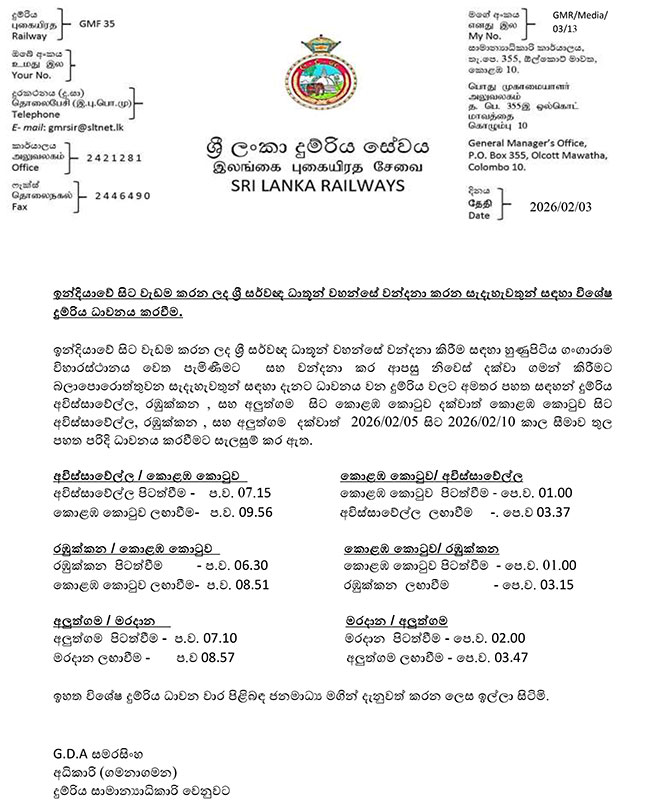 ඉන්දියාවේ සිට වැඩම කරන ලද ශ්රී සර්වඥ ධාතූන් වහන්සේ වන්දනා කරන සැදැහැවතුන් සඳහා විශේෂ දුම්රිය වාර කිහිපයක් ධාවනය කරවීමට දුම්රිය දෙපාර්තමේන්තුව පියවර ගෙන තිබේ.