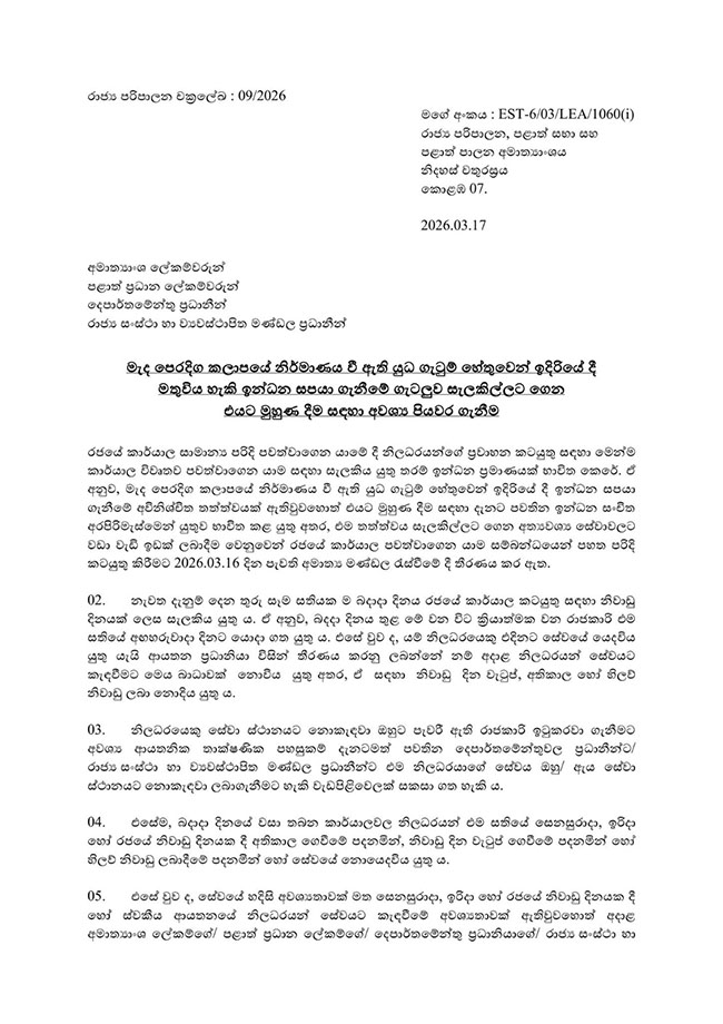 බදාදා නිවාඩුවට අදාළ චක්රලේඛය නිකුත් වෙයි