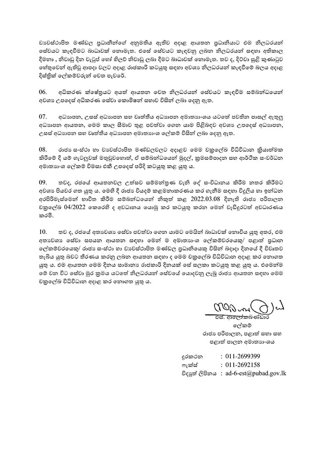 එසේ වුවද සේවයේ හදිසි අවශ්යතාවය මත සෙනසුරාදා, ඉරිදා හෝ රජයේ නිවාඩු දිනයක දී හෝ ස්වකීය ආයතනයේ නිලධරයන් සේවයට කැඳවීමේ අවශ්යතාවයක් ඇති වුවහොත් අදළා අමාත්යාංශ ලේකම් / පළාත් ප්රධාන ලේකම් / දෙපාර්තමේන්තු ප්රධානියාගේ හෝ රාජ්ය සංස්ථා ව්යවස්ථාපිත මණ්ඩල ප්රධානීන්ගේ අනුමැතිය ඇතිව අදාළ ආයතන ප්රධානියා එම නිලධරයන් සේවයට කැඳවීමට බාධාවක් නොමැති බවද අදාළ චක්රලේඛයේ සඳහන් වනවා.