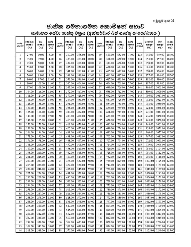 බස් ගාස්තු සංශෝධනය වූ මිල ගණන් පහතින් දැක්වේ.